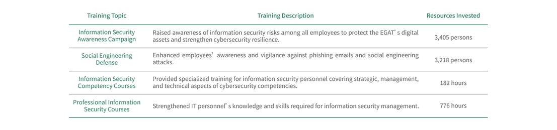 In 2024, EGAT conducted the following information security training programs, offering tailored courses for different employee groups to enhance overall information security awareness and capabilities.