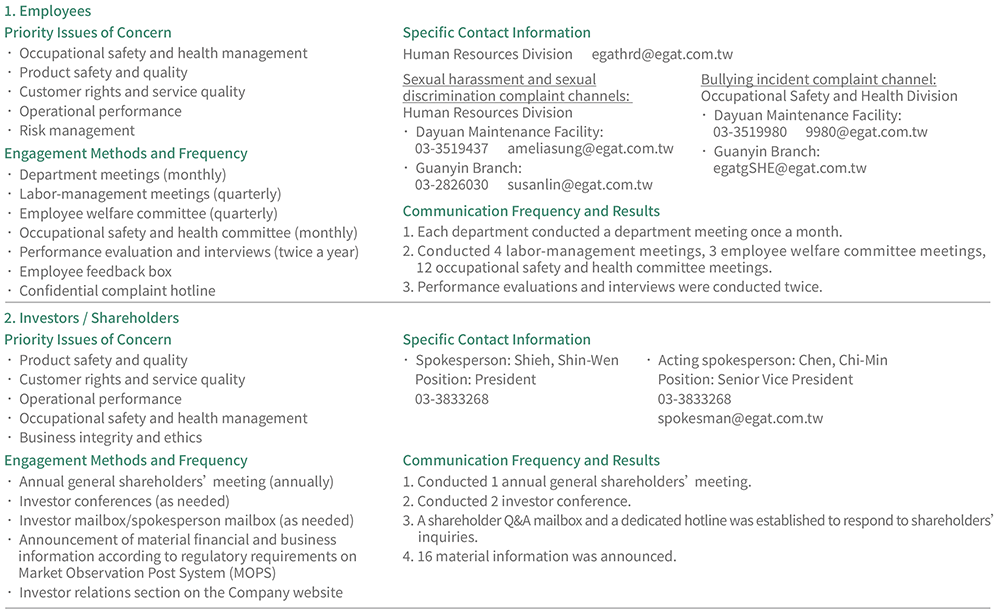 In order to establish a good communication channel with employees, announce various employee benefits, operational information and other information from time to time, and encourage internal and external personnel to report dishonest or inappropriate behavior, the Company has established and announced an internal independent reporting mailbox on the Company website and internal website for use by persons within and outside the Company. Email:hrd@egat.com.tw Contact information:03-3519437 Human Resources Div./Mrs. Sung |