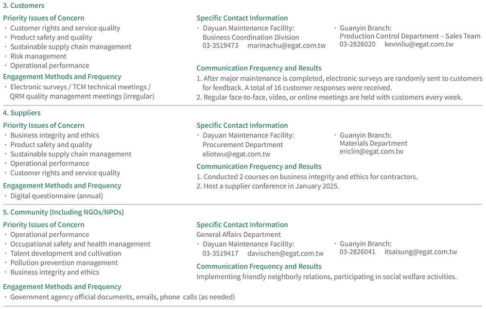 The identification and communication of stakeholders is the basis for the sustainable development of an enterprise. EGAT attaches great importance to trust and communication with stakeholders. Adopting GRI Standards and the AA1000SES (Stakeholder Engagement Standards), stakeholders are categorized based on the five major principles of dependency, responsibility, influence, diversity of perspectives, and tension of concerns, and further defined into 7 major categories: Employees, Investors/Shareholders, Customers, Suppliers, Community, Government/Competent Authorities, and Acedemic Institutions.