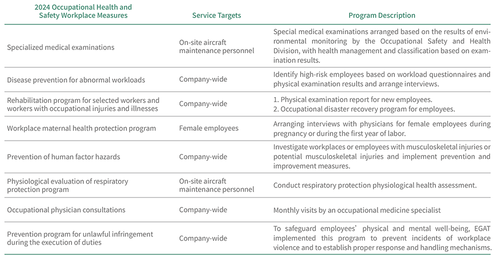 EGAT obtained Taiwan ISO 45001 Occupational Safety and Health Management System certification in 2022, affirming its adherence to occupational safety and health regulations and fulfillment of related responsibilities and obligations. In addition to continuous improvement of the work environment and ongoing implementation of occupational environment testing and automatic inspection of hazardous machinery equipment, EGAT ensures occupational safety and health training for employees, along with relevant certification. These measures aim to eliminate workplace hazards, reduce false alarms, prevent occupational accidents, and actively promote employee physical and mental health, progressing towards the goal of a healthy and safe workplace. EGAT’s occupational safety and health management system covers all workplaces, including Taoyuan, Guanyin, and TSA maintenance department and their affiliated domestic and international outstations, totaling 3,441 personnel, including 3,175 employees and 266 workers such as security guards, construction contractors, and maintenance/manufacturing workforce dispatch personnel.