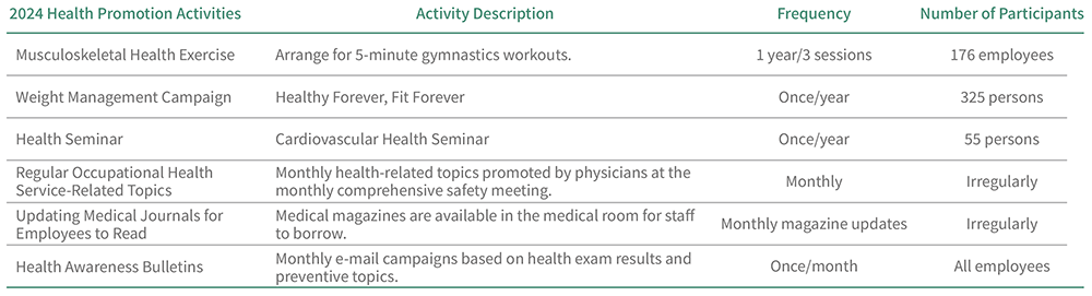 - Physician on-site service: To perform injury and illness rehabilitation for colleagues, work suitability assessments, work-related injury prevention, and health counseling services. Assess the injuries and illnesses of employees to determine their condition. If necessary, provide medical prescriptions, conduct functional assessments to evaluate their ability to perform tasks, and offer recommendations for modifying their job responsibilities or work environment to accommodate their health needs. The subsidy amount for 2024 was NT$152,285.