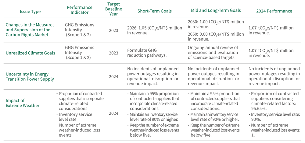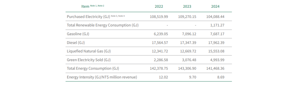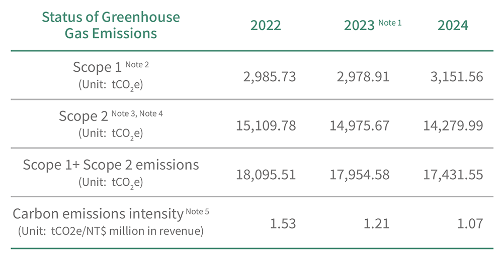 Note 2: GHG emissions were calculated using the operational control method for inventory, with the calculation method being activity data * emission factor * GWP value (emission factor values refer to the 2019 Environmental Protection Administration’s GHG emission factor management table version 6.0.4, and GWP values refer to the IPCC Sixth Assessment Report (2021)). GHG gases include carbon dioxide, methane, nitrous oxide, hydrofluorocarbons (HFCs), perfluorocarbons (PFCs), sulfur hexafluoride (SF6), and nitrogen trifluoride (NF3).