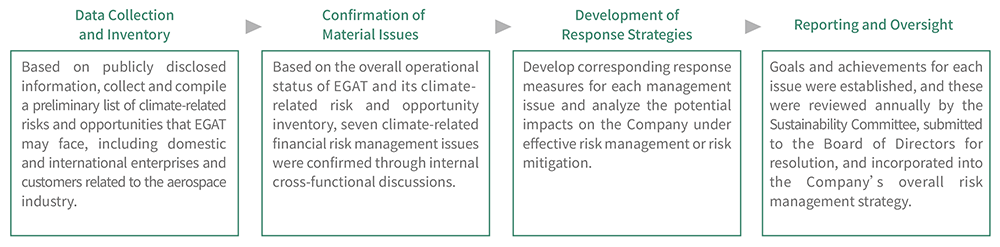 To identify the impacts of climate change on operations and strategic management, EGAT, through its Executive Team under the Sustainability Committee, established a climate risk management process in 2023. The process identified 4 climate-related risks and 3 climate-related opportunities with financial impacts on the Company, and assessed the time horizon Note 1 and value chain impact scope Note 2 of these risks and opportunities. Based on these assessments, corresponding management measures and targets were formulated. The execution of management measures and achievement of targets are regularly reviewed by the Sustainability Committee and submitted to the Board of Directors for resolution, ensuring alignment between climate risk management and the Company’s sustainable development strategy.