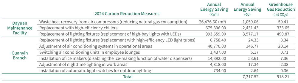 Note 3: Since the 2024 electricity emission factor had not been announced at the time of conducting the 2024 GHG inventory, EGAT applied the 2023 emission factor of 0.494 kgCO₂e/kWh as the inventory standard. The 2023 inventory was also evaluated using the 2023 electricity emission factor of 0.494 kgCO₂e/kWh. In 2022, Guanyin Branch referenced the Energy Policy and Planning Office’s announcement of the 2021 electricity emission factor of 0.509 kgCO₂e/kWh, while Dayuan Maintenance Facility referenced the 2022 electricity emission factor announcement of 0.495 kgCO₂e/kWh. This was because, when conducting the 2022 greenhouse gas inventory, the 2022 electricity emission factor had not yet been published, so the 2021 factor was used as the inventory standard.
