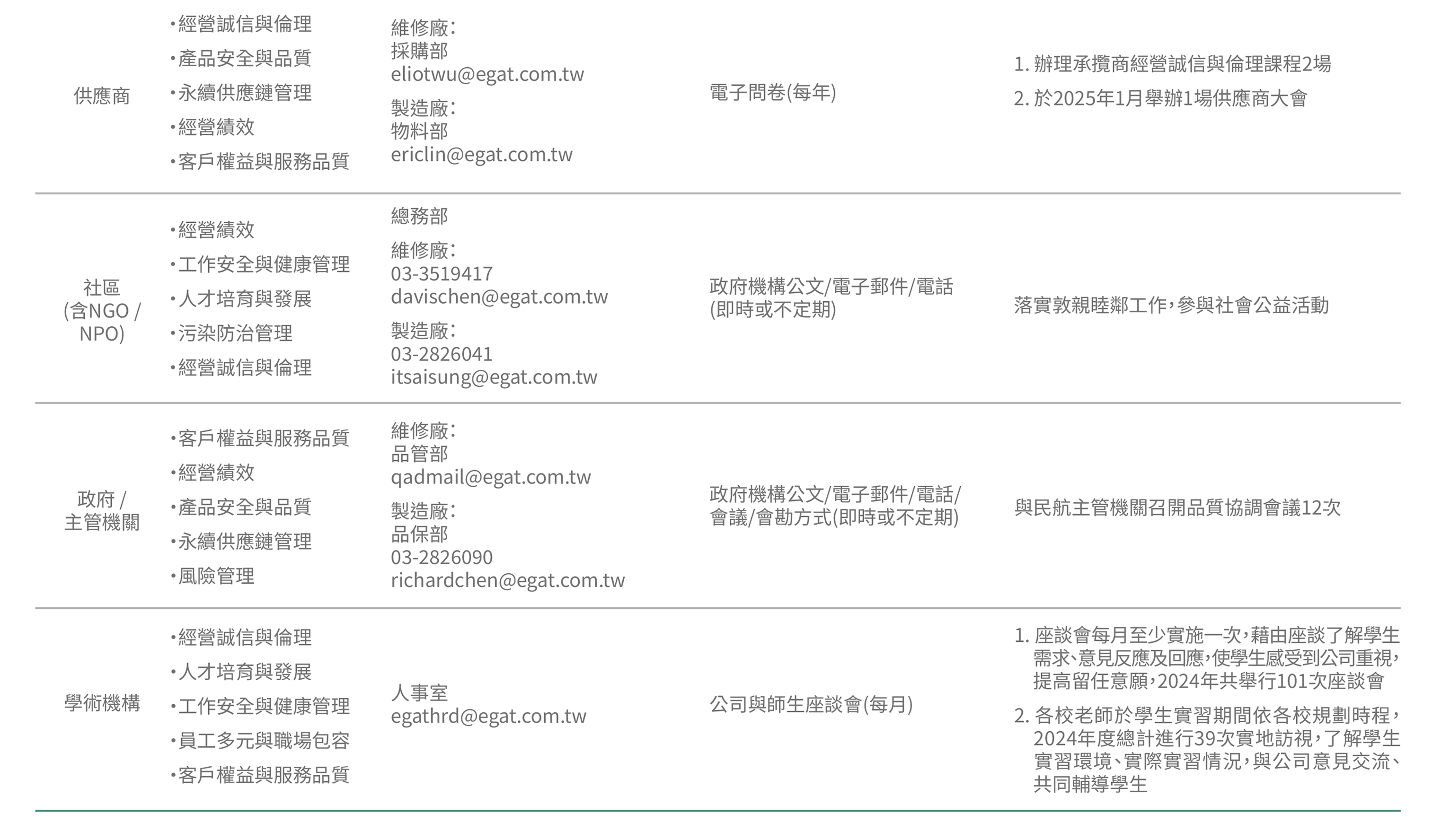 除透過利害關係人關注程度問卷了解利害關係人對於永續主題之關注,長榮航太也以多元管道即時或不定期地與利害關係人議合,希望了解利害關係人之期待、促成雙向溝通。長榮航太每年至少一次定期向董事會提報執行情形,2024年度與利害關係人溝通、議合結果,係於2024年12月向永續發展委員會與董事會提報。