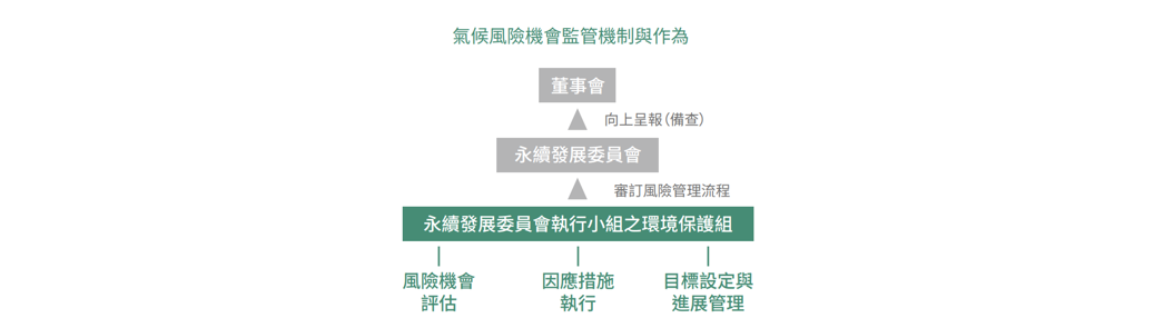 長榮航太為積極強化永續經營理念與環境永續的治理機能,2023年經董事會決議於董事會下設「永續發展委員會」,作為長榮航太永續治理的最高指導單位,並致力於將氣候變遷相關治理方針、管理制度及業務流程整合至企業既有治理架構。