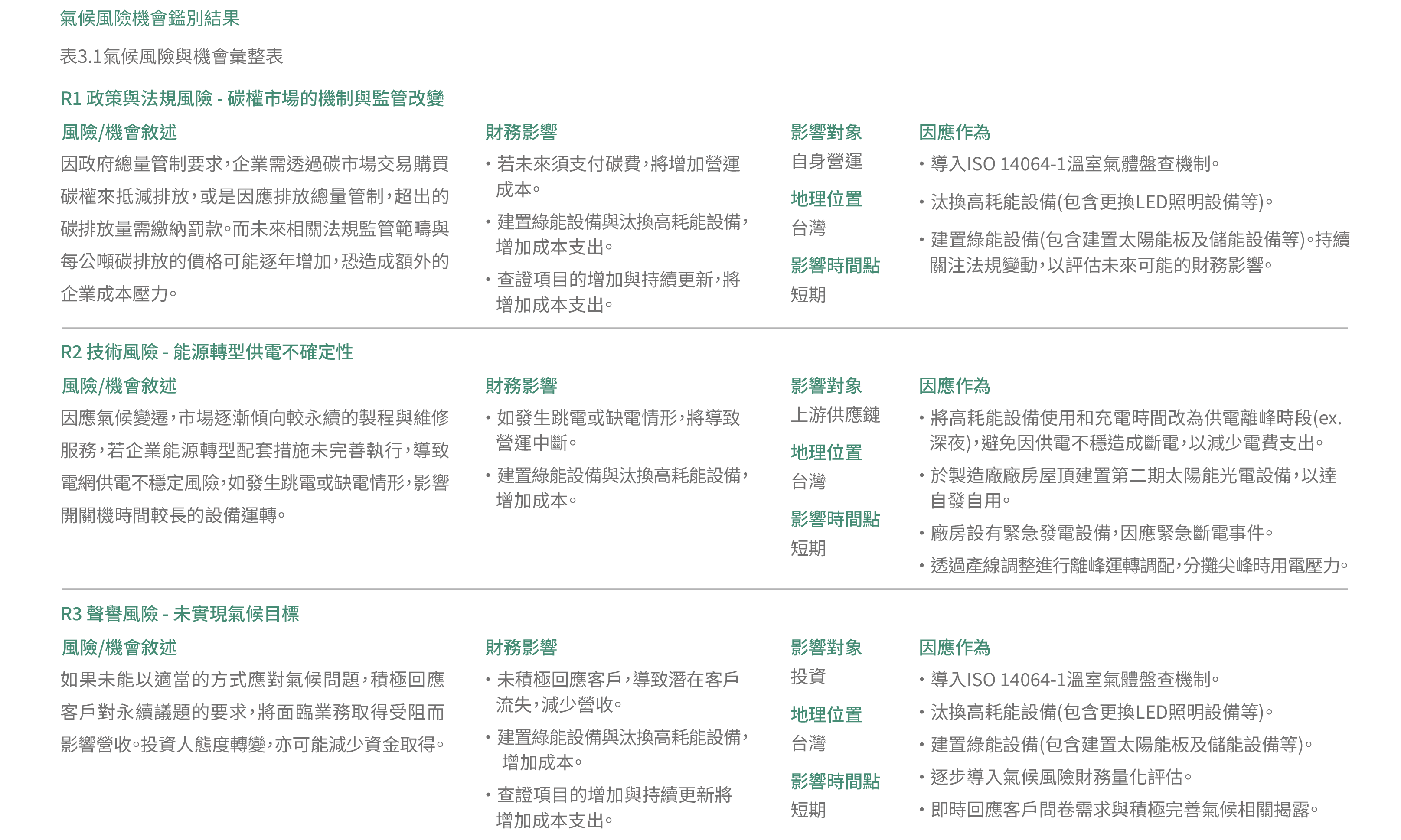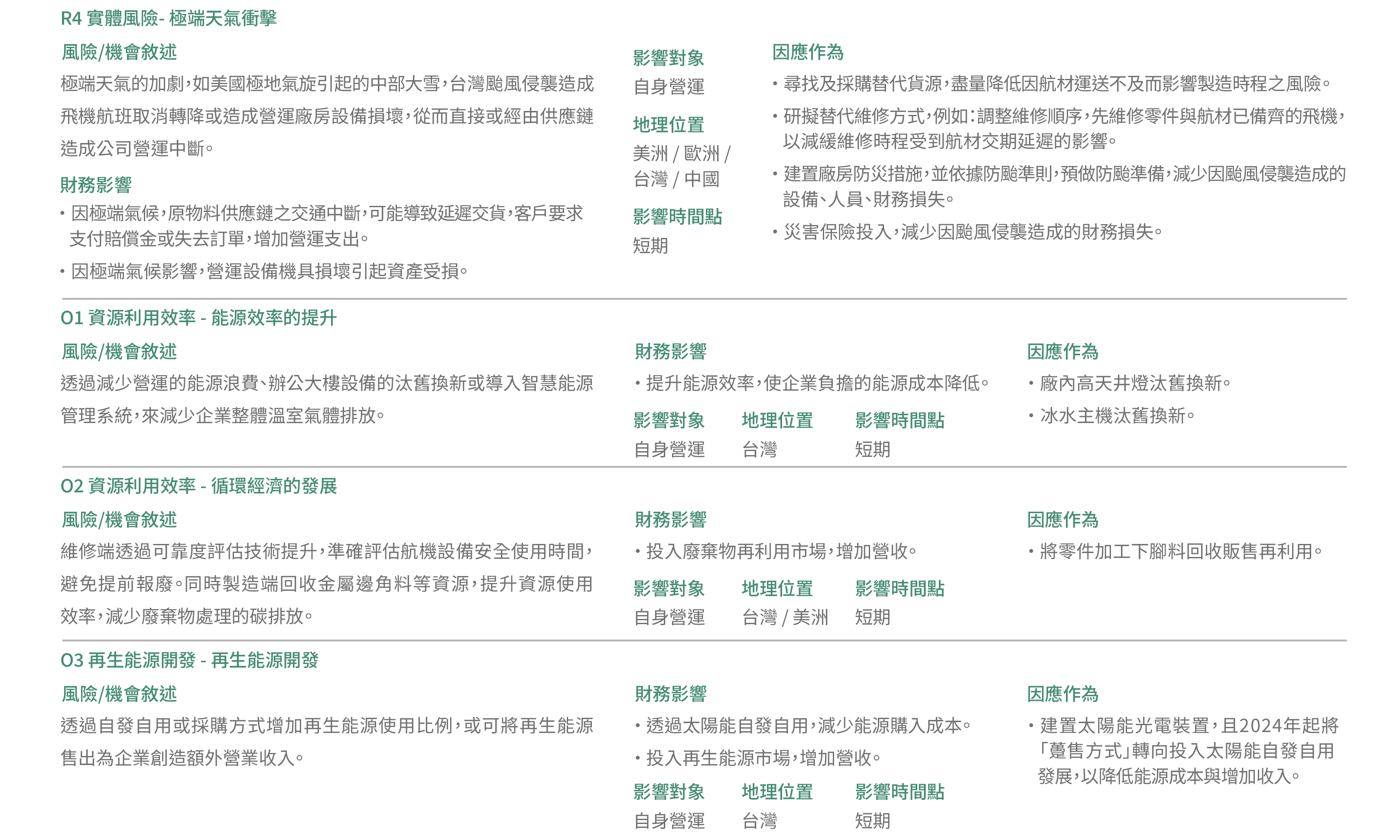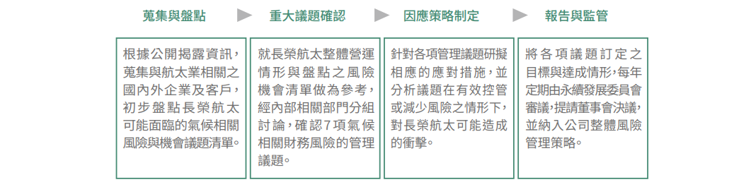 為鑑別氣候變遷對營運與策略管理的影響,長榮航太已於2023年由永續發展委員會執行小組建立風險管理流程,鑑別出4項氣候風險與3項氣候機會對公司財務的衝擊,並評估該氣候風險機會的影響時間註1及對價值鏈的影響範圍註2,再據此制定相應的管理措施與目標。各項管理措施的執行與目標達成情形定期由永續發展委員會審議並提請董事會決議,確保氣候風險管理與企業永續發展戰略一致。