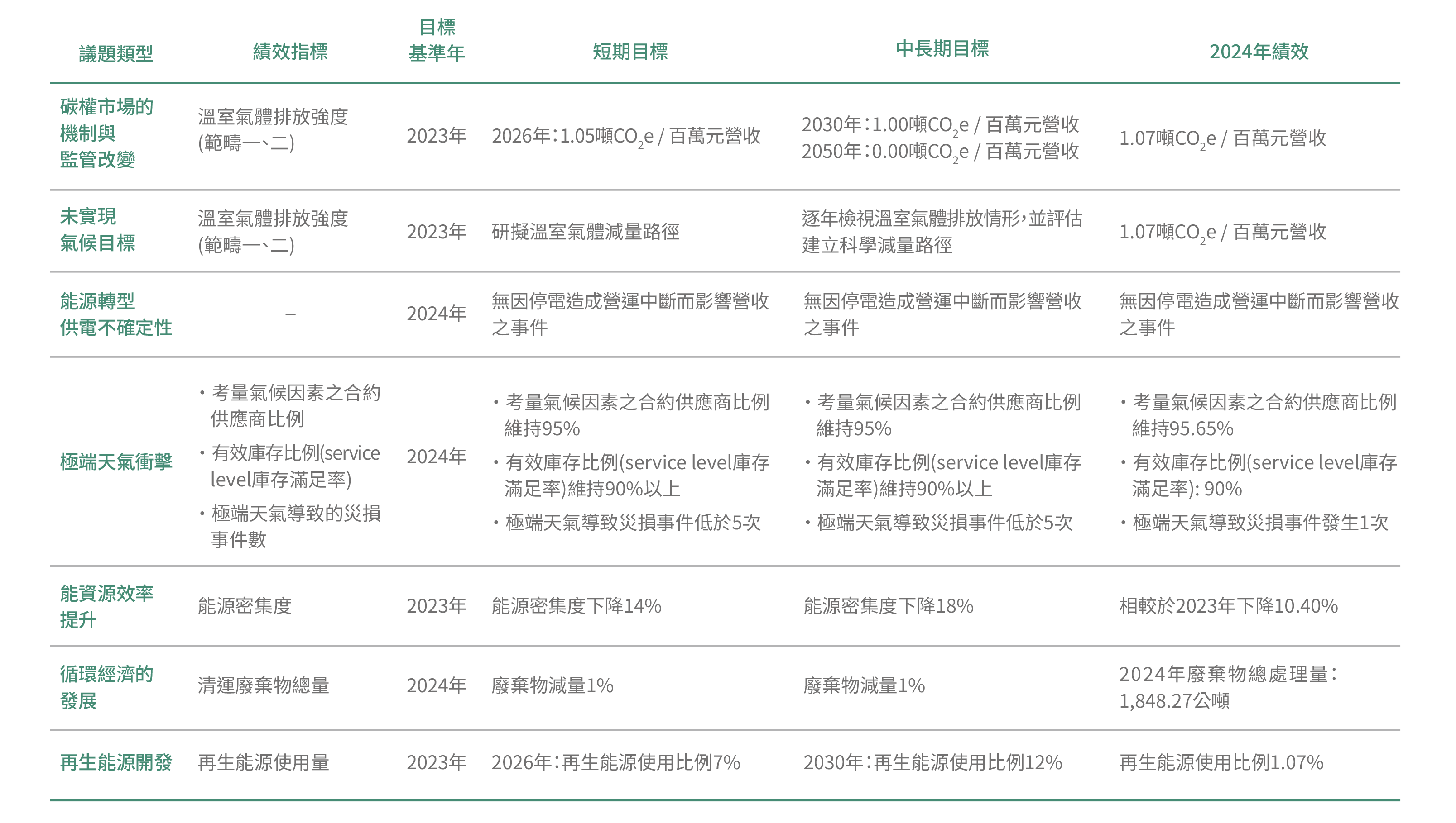 隨著風險評估的深化與營運策略的發展,2024年進一步除因應減碳成效調整並加強溫室氣體排放目標外,更納入多元的環境與營運指標,以提升氣候管理策略的全面性。