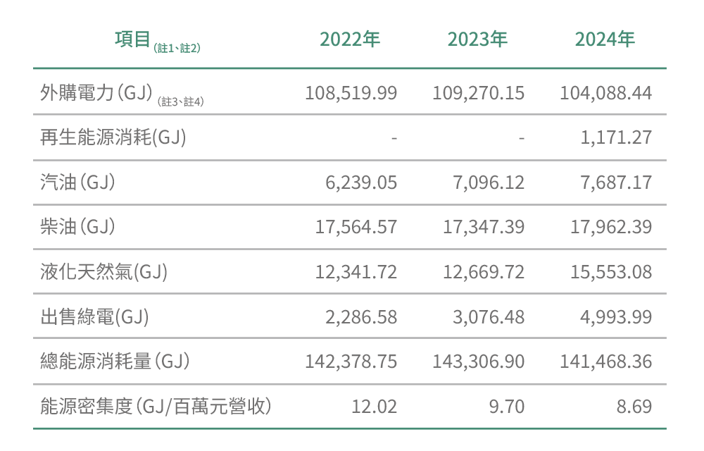 註2:原先採用之溫室氣體排放係數管理表6.0.4版所提供的熱值進行能源計算依據,而為符合SASB準則規範,2023起使用較高的熱值(總熱值,Gross Calorific Values, GCV)計算來自燃料和生物燃料的能源消耗,並修正過往數據。主要影響項目分別為汽油、柴油與液化天然氣,2022與2023年之汽油能源使用量較先前報導提高43%,其次柴油提高28%,液化天然氣提高19%。此調整僅替換熱值係數,並未調整過往活動數據。