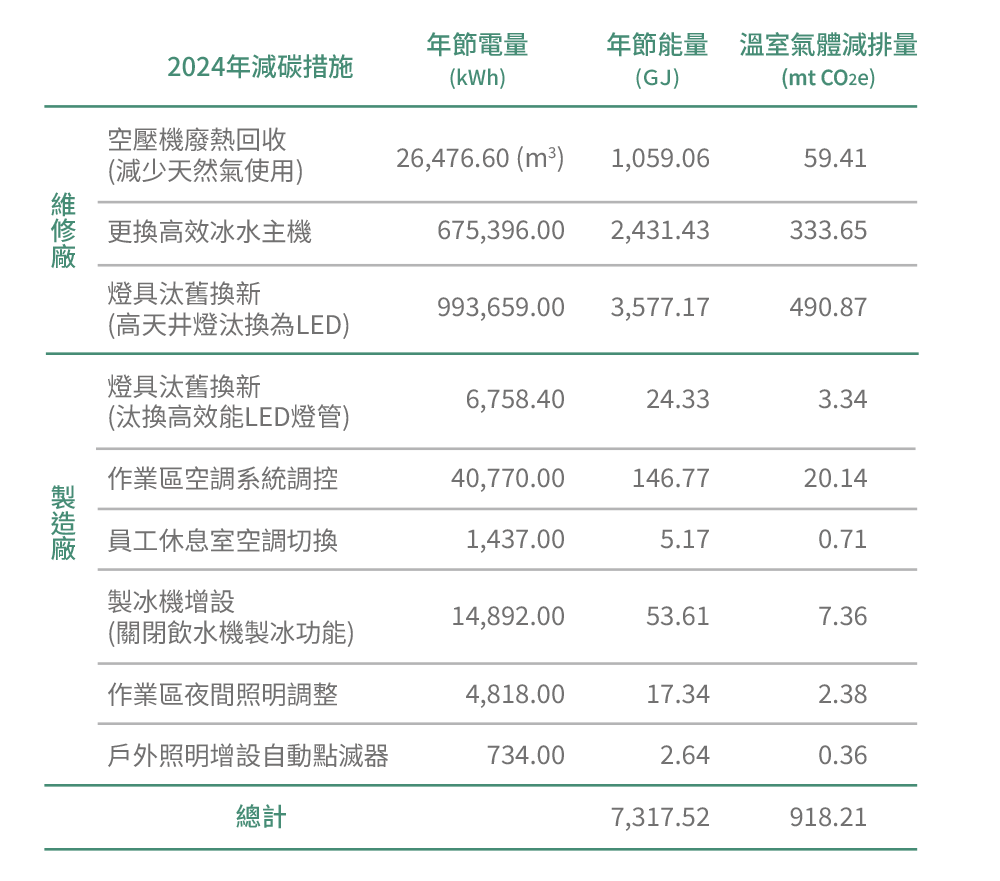 註3:因執行2024年溫室氣體盤查業務時,2024年電力排碳係數尚未公布,故以2023年係數0.494作為盤查標準,2023年則以當年度電力排碳係數0.494公斤CO2e/度進行評估。2022年,製造廠援引能源局公告2021年度電力排碳係數0.509公斤CO2e/度,維修廠區則援引能源局公告2022年度電力排碳係數0.495公斤CO2e/度。係因製造廠執行2022年溫室氣體盤查業務時,2022年電力排碳係數尚未公布,故以2021年係數作為盤查標準。
